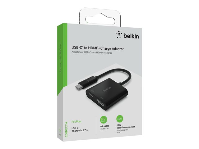 Belkin USB-C to HDMI + Charge Adapter - Näyttösovitin - 24 pin USB-C uros to HDMI, USB-C (power only) naaras - musta - 4K-tuki, USB Power Delivery (60W)