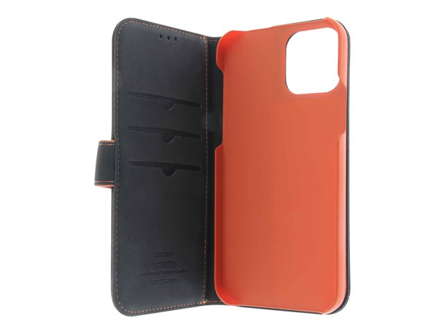 Insmat Exclusive - Läppäkansi matkapuhelimelle - nahka, kartonki + paperi + alumiinifolio - musta/oranssi malleihin Apple iPhone 11 650-2967